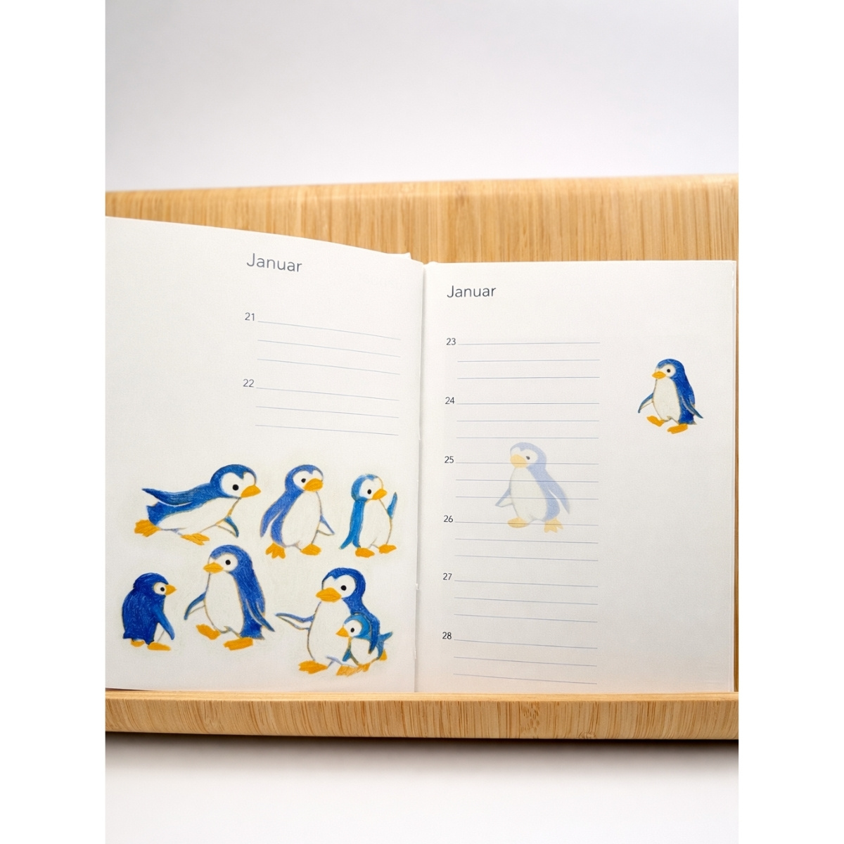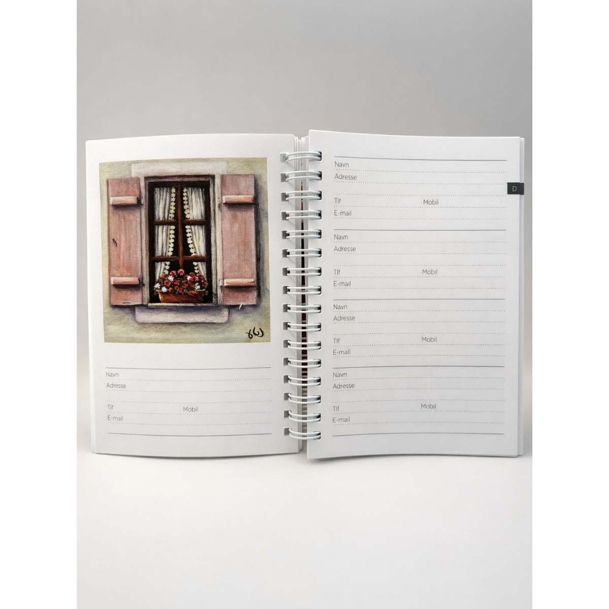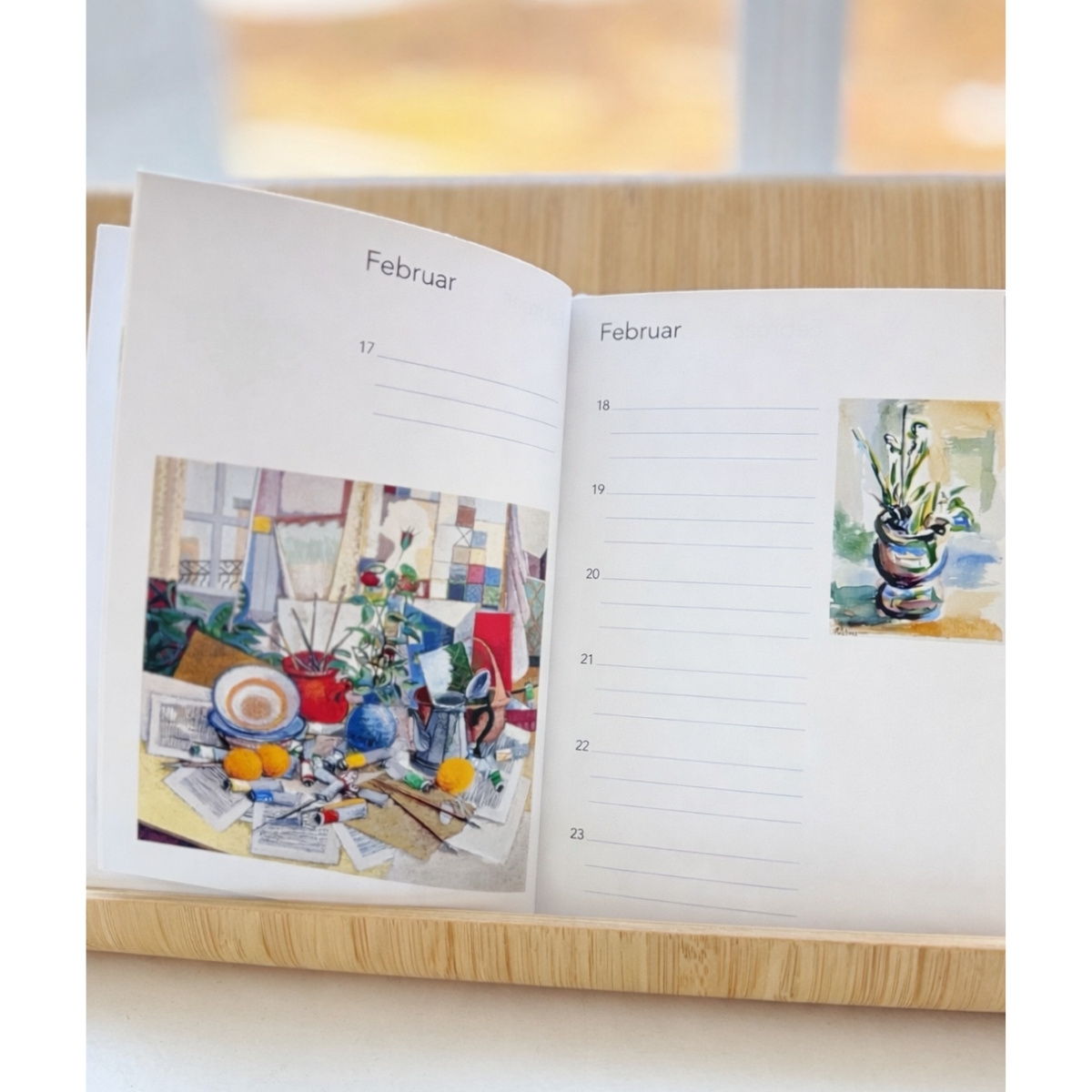 To notesbøger i én — sæt bestående af en adressebog og en fødselsdagsbog, begge i formatet 11 × 15,5 cm. Fødselsdagsbogen kan også bruges til daglige noter, og kan derfor nemt fungere som en lille planner. Begge bøger er illustreret med motiver malet af mund- og fodmalende kunstnere fra hele verden.