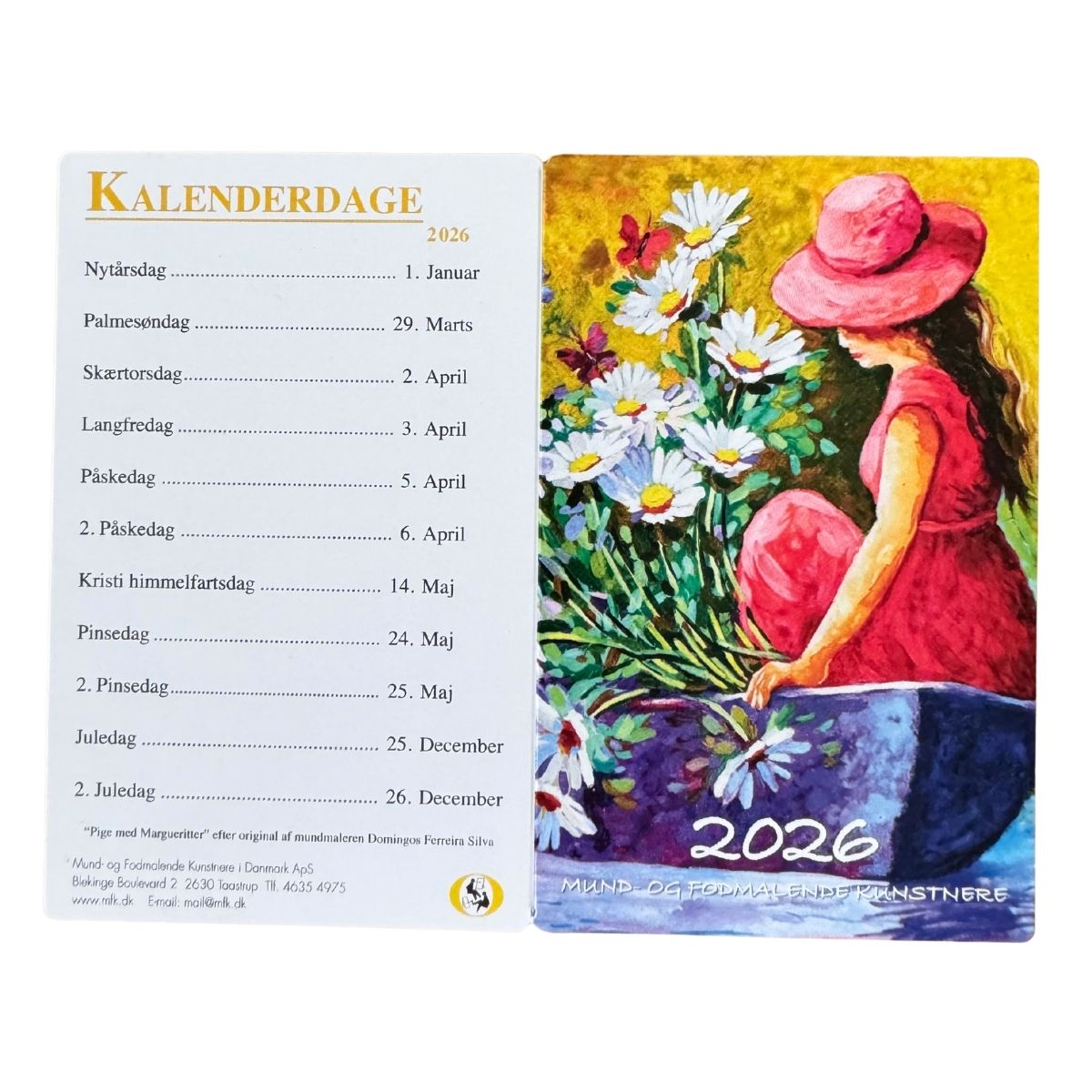 Mund- og fodmalende kunstnere er en verdensomspændende organisation, stiftet i 1956 i Tyskland af otte kunstnere med fysiske handicap. De otte kunstnere ønskede en organisation, der skulle fungere som en virksomhed til selvhjælp – ikke som velgørenhed. Sammenslutningen af kunstnere voksede sig hurtigt større og nåede til Danmark i 1960’erne. Siden da har vi været kendt for, to gange årligt, at sende kort ud i det danske land: Én forårspakke og én julepakke med kort og kalendere af årets motiver.