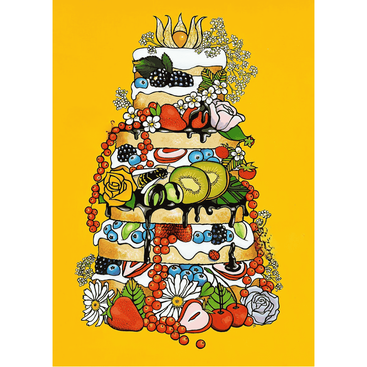 Plakat med motiv af en frugtkage, malet med munden af Jennie Sjöström fra Sverige.