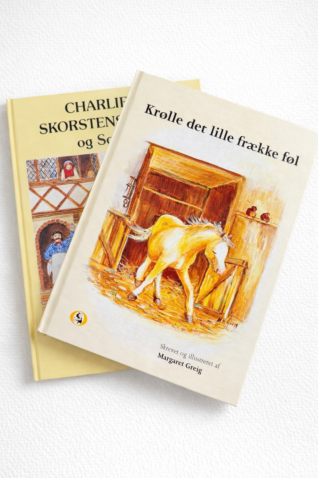 Tilbud på børnebøger — Krølle det frække føl, skrevet og illustreret af australske mundmaler Margaret Greig, og Charlie Skorstensfejeren og Sorte af australske mundmaler Bruce Peardon. To søde historier om at have mod på livet.